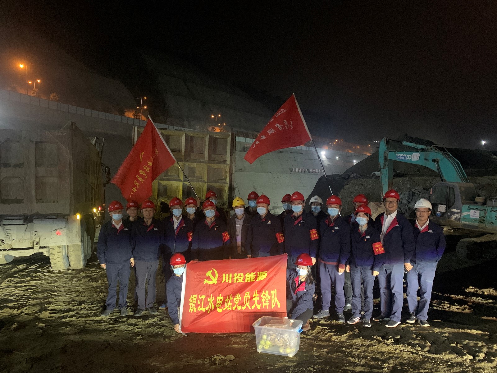 11月13日晚上22時,銀江水電站CIII標導流明渠項目工地上仍然燈火通明、機械轟鳴,為保障“11.30導流明渠過水”目標順利實現,工人們正在挑燈夜戰、緊張有序施工。為堅決貫徹川投能源黨委“持續推進‘我為群眾辦實事’實踐活動”要求,確保大江截流目標如期實現,攀水電公司工會聯合機關第二黨支部組織開展了“挑燈夜戰保截流,凝心聚力鼓干勁”主題黨日活動,組織支部黨員、入黨積極分子及志愿服務隊17人奔赴施工一線,為深夜仍在堅守崗位的施工及值班人員送上了熱騰騰、香噴噴的鹵雞翅、鹵蛋和香梨。攀水電公司黨總支委員、副總經理吳巍嶼,黨總支委員、紀檢小組長、總經理助理楊銳及總經理助理唐伽帶隊開展活動。