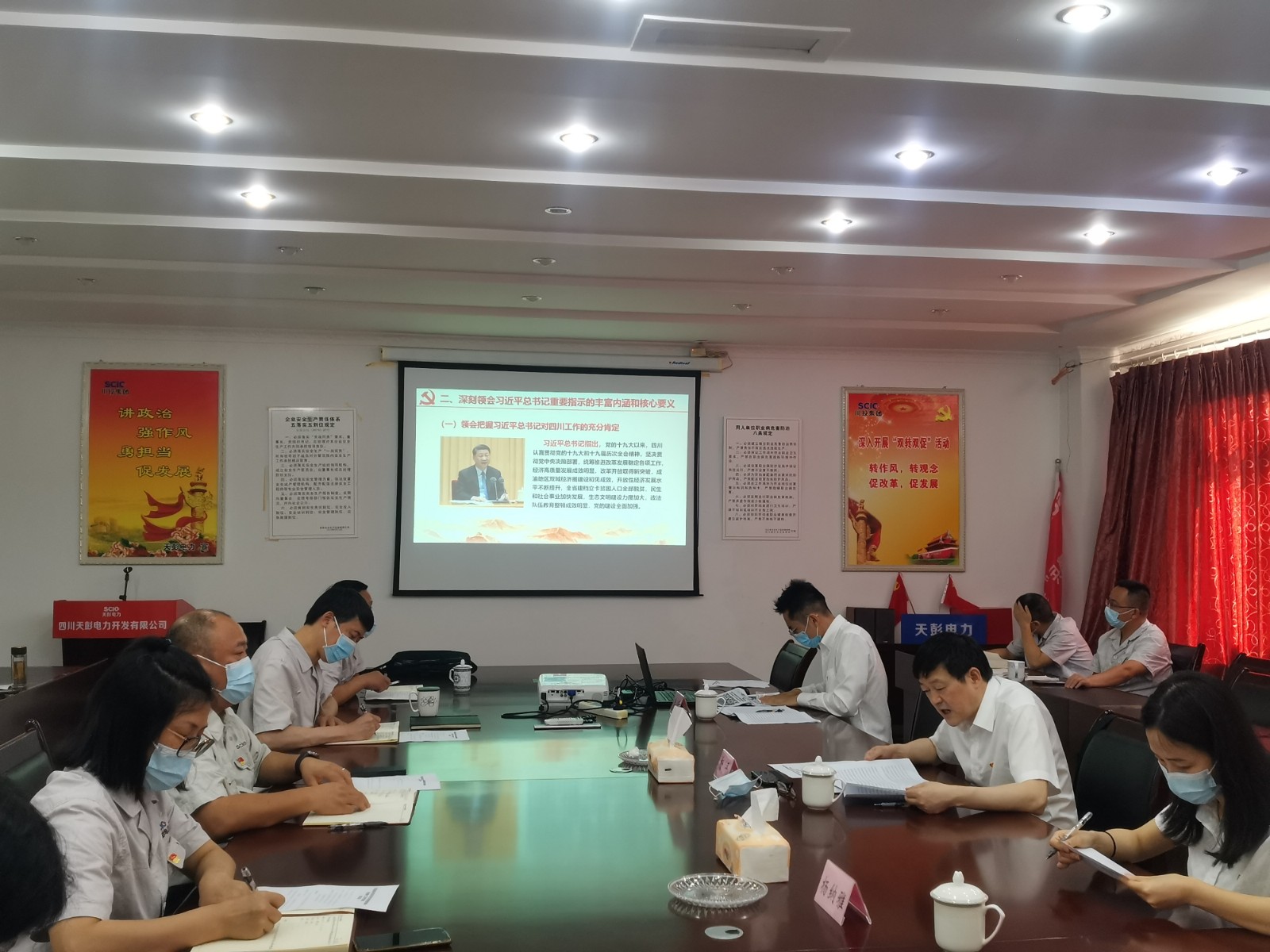 為迅速落實(shí)上級(jí)黨委有關(guān)學(xué)習(xí)宣傳貫徹的部署和要求,7月8日,川投能源黨委委員、副總經(jīng)理、總法律顧問楊平率隊(duì)赴天彭電力,專題宣講習(xí)近平總書記來川視察重要指示精神暨省第第二次黨代會(huì)精神。川投能源審計(jì)部副經(jīng)理?xiàng)罴{雅、川投能源黨群工作部李睿參加宣講活動(dòng)。