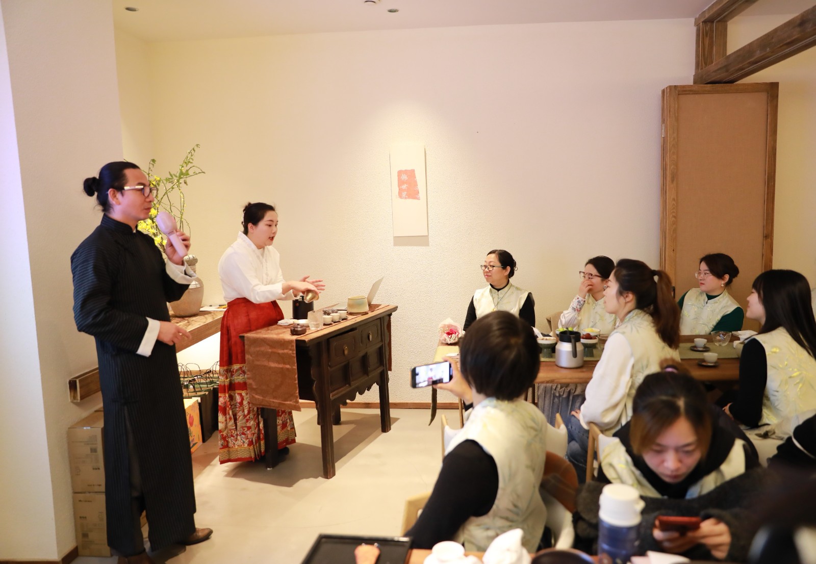 活動現場,茶藝老師從茶葉的起源、分類、功效、作用和泡茶知識技巧等方面進行講解,并演示了沖泡流程。隨后進行了實操比賽,大家紛紛動手練習沖泡技巧,備器、煎水、賞茶、潔具、置茶、泡茶、奉茶、飲茶……,整個課堂充滿了幽幽茶香,大家在輕松愉悅的氛圍中,學習傳統茶藝禮儀。
