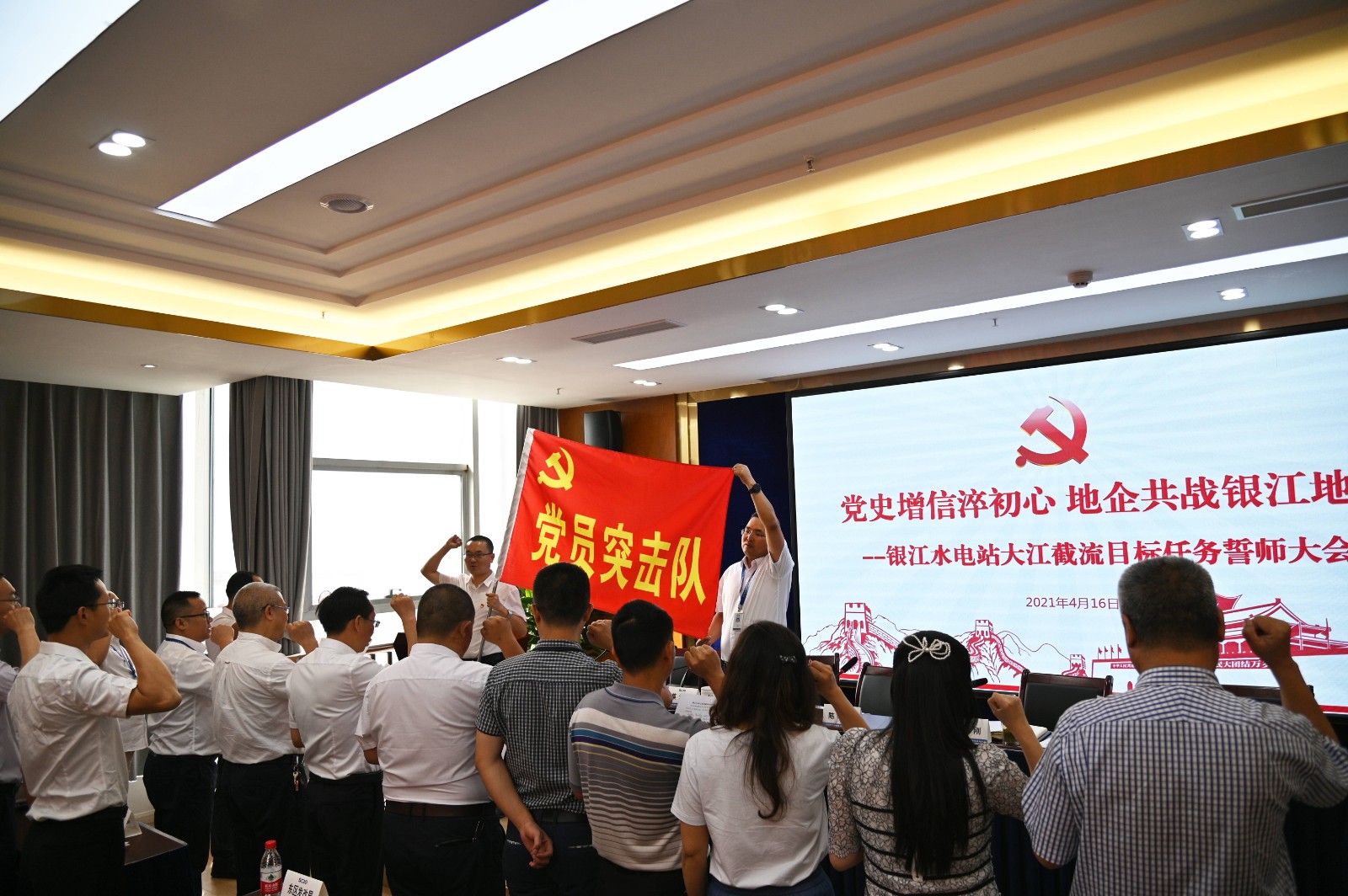 會(huì)上,全體參會(huì)人員共同學(xué)習(xí)了市委書記張正紅在市級領(lǐng)導(dǎo)干部和縣級主要負(fù)責(zé)同志讀書班暨市委理論學(xué)習(xí)中心組專題學(xué)習(xí)(擴(kuò)大)會(huì)議上的講話精神;蔡承德宣讀了銀江水電站項(xiàng)目建設(shè)黨員突擊隊(duì)人員名單;徐孝剛與陳康共同向黨員突擊隊(duì)授旗并簽訂目標(biāo)承諾書;全體突擊隊(duì)隊(duì)員在隊(duì)旗前進(jìn)行了莊重宣誓。