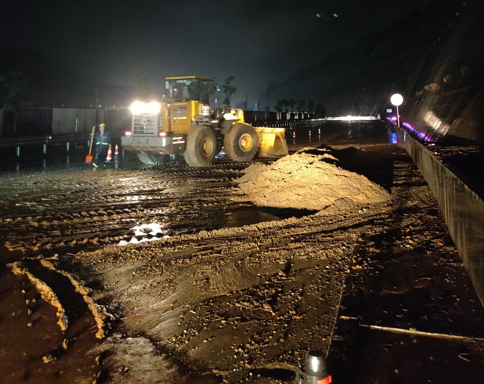 7月5日17時40分,攀枝花市地災辦、防汛辦、氣象臺聯合發布山洪和地質災害預警信息,公司安全環保部第一時間傳達預警信息,當晚公司防汛值班領導川投能源副總經理、攀水電公司黨總支書記、董事長徐孝剛帶領值班人員從8時到11時進行防汛值班檢查,對各值班點,重要部位巡視,當晚21時45分,22時15分攀枝花氣象臺分別發布雷電黃色預警、暴雨黃色預警。攀水電公司組織各參建單位按照防洪度汛工作要求,冒雨開展雨中巡查,對渣場、導流明渠,銀江大橋、砂石拌和系統等重要部位及施工區域進行全面排查。當晚23點左右,值班人員雨中巡查,發現暴雨導致轉沱溝邊坡上方工業園區內部分棄渣被沖刷到G227國道,嚴重影響道路的正常通行,本著國企社會責任,公司防汛防災帶班領導徐孝剛立即安排二灘監理、葛洲壩路橋組織機械設備及人員進行清理,于次日凌晨3點左右清理完畢,確保了G227國道的正常通行。